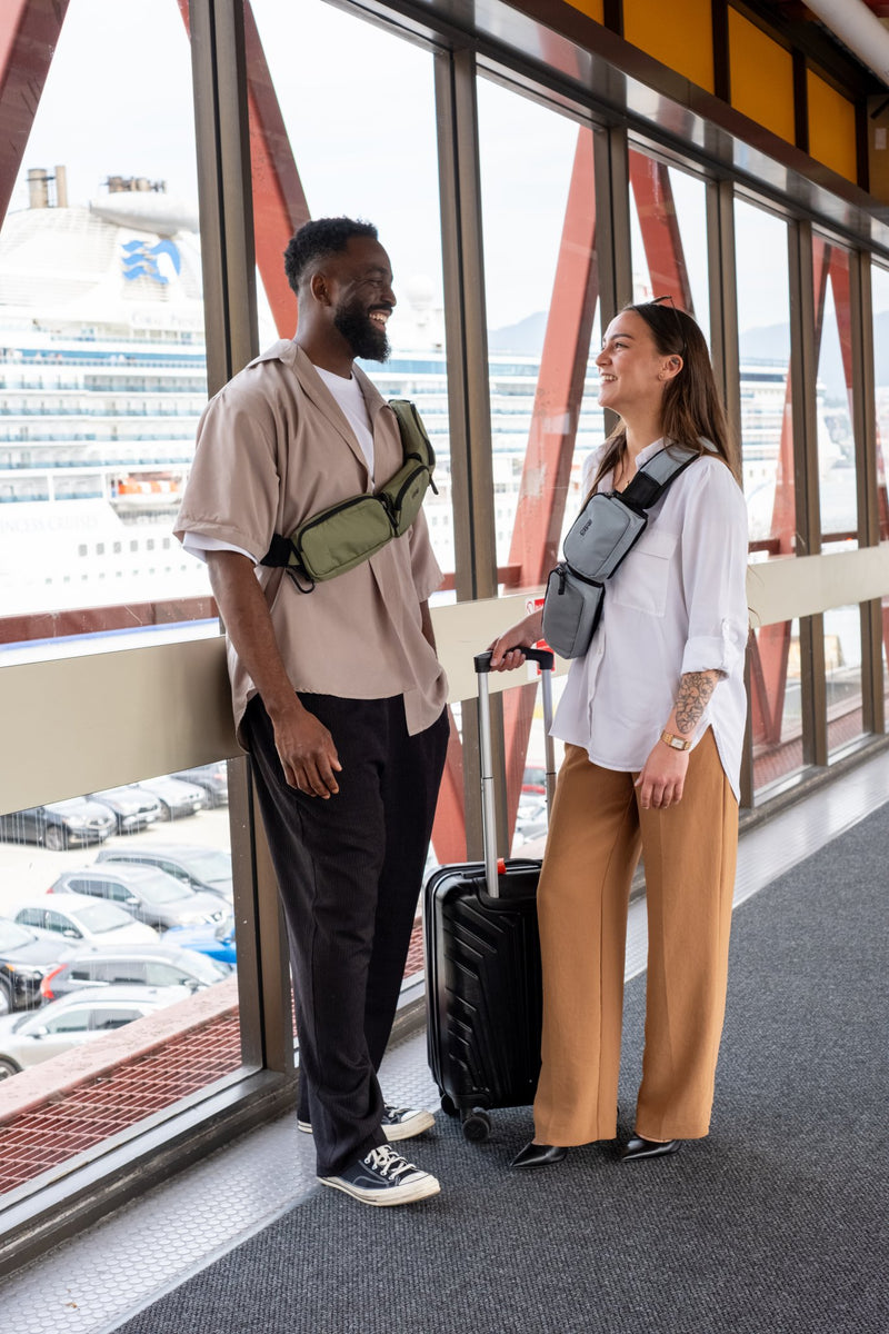 RFID-protected passport and cards. Organized travel documents. Comfortable long-distance wear for airports and cities.